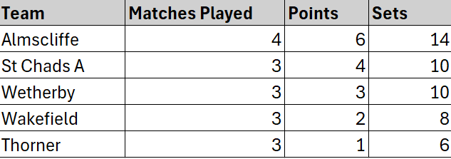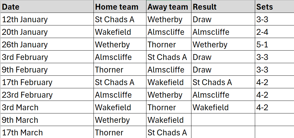 Division 1 (6 teams): Almscliffe, St Chad’s A, Wakefield, Wetherby, Thorner