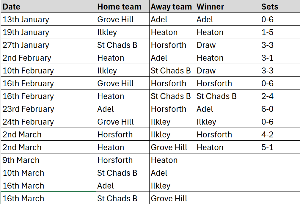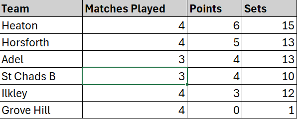 Division 2 (7 teams): Heaton, Horsforth, Adel, St Chads B, Ilkley, Grove Hill